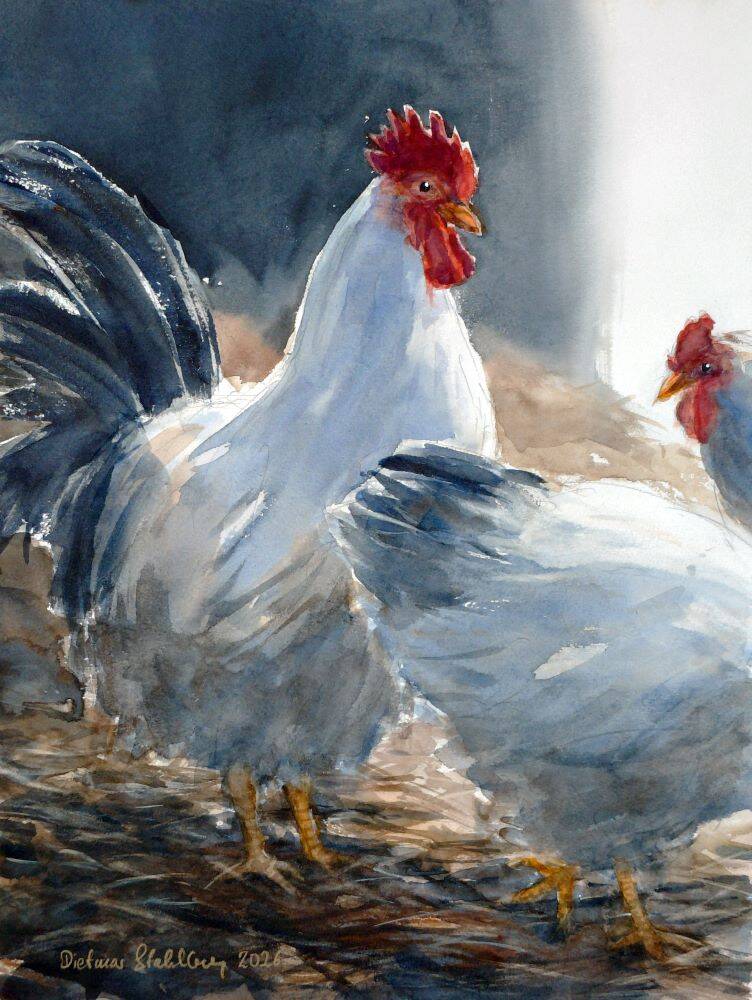 2026-020 Hahn und Hühner, 2026, (38x29/50x40cm) 280 €